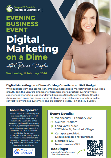 Digital Marketing on a Dime - Driving Growth on an SMB Budget With budgets tight and teams lean, small businesses need marketing that delivers real growth. Join the Samford Chamber of Commerce for a practical evening where experienced marketing leader and Small Business Growth Mentor Renée Chaplin shares proven email and social media strategies to stretch every marketing dollar, convert followers into customers, and build lasting loyalty - on an SMB budget